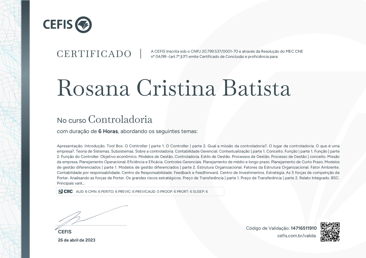 O certificado acima atesta que ROSANA CRISTINA BATISTA concluiu com êxito o curso Controladoria em 26/04/2023 às 17:04:15,