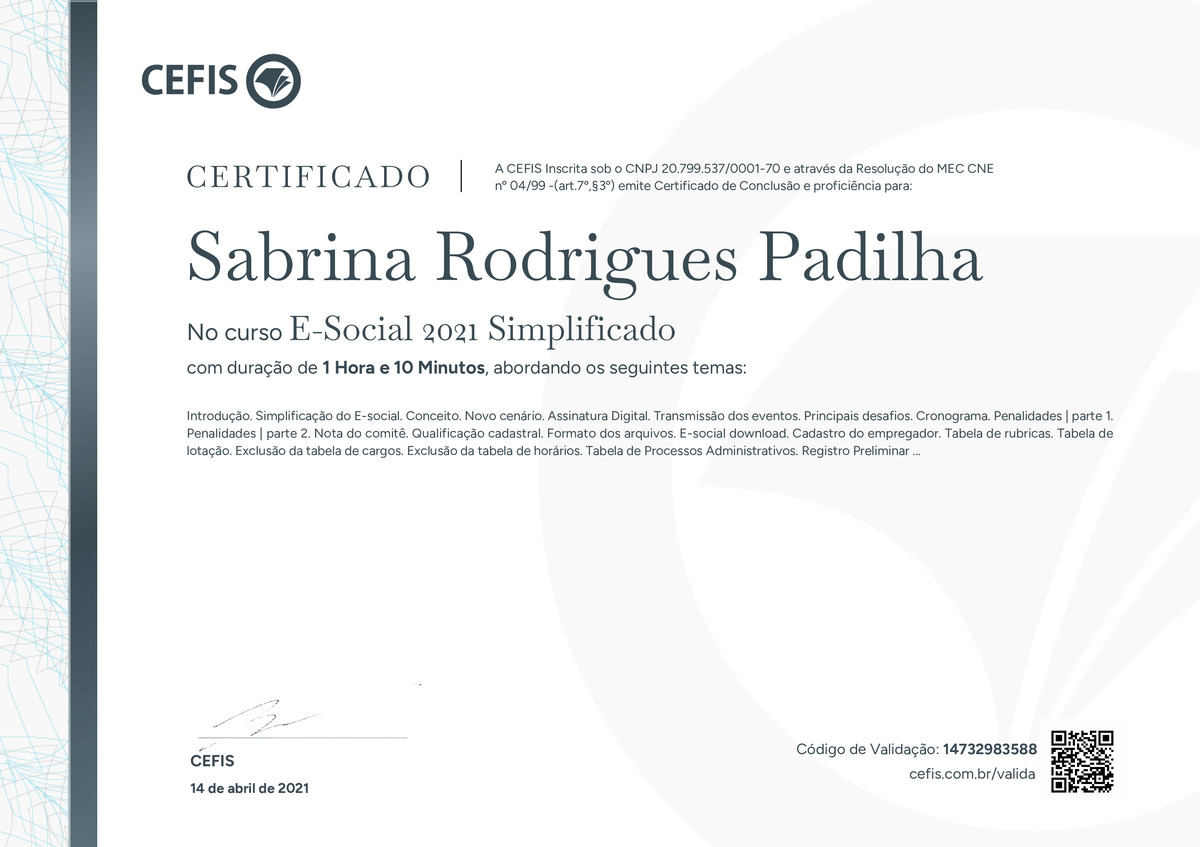 O certificado acima atesta que SABRINA RODRIGUES PADILHA concluiu com êxito o curso E-Social 2021 Simplificado em 14/04/2021 às 18:04:45, ministrado por JEFFERSON DANTAS.