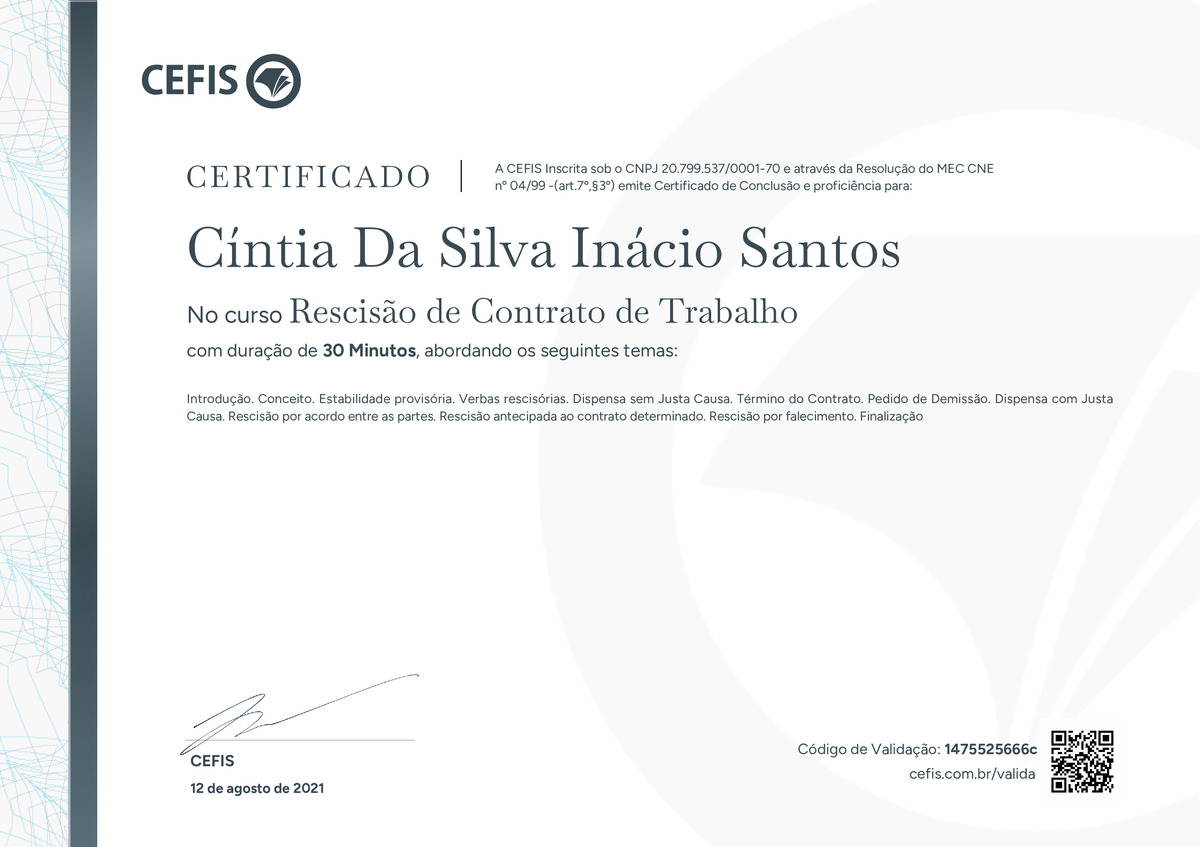 O certificado acima atesta que CÍNTIA DA SILVA INÁCIO SANTOS concluiu com êxito o curso Rescisão de Contrato de Trabalho em 12/08/2021 às 19:08:31,