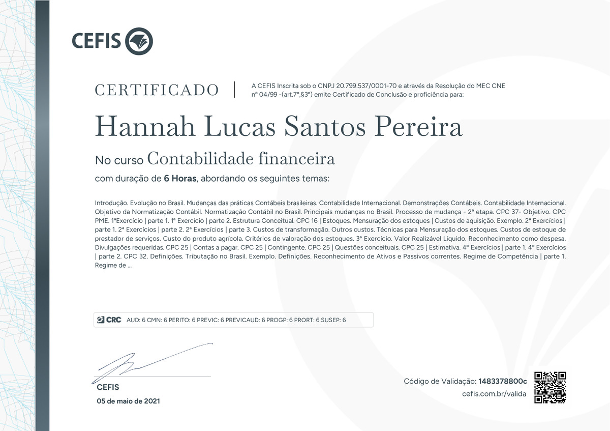 O certificado acima atesta que HANNAH LUCAS SANTOS PEREIRA concluiu com êxito o curso Contabilidade financeira em 05/05/2021 às 15:05:53,