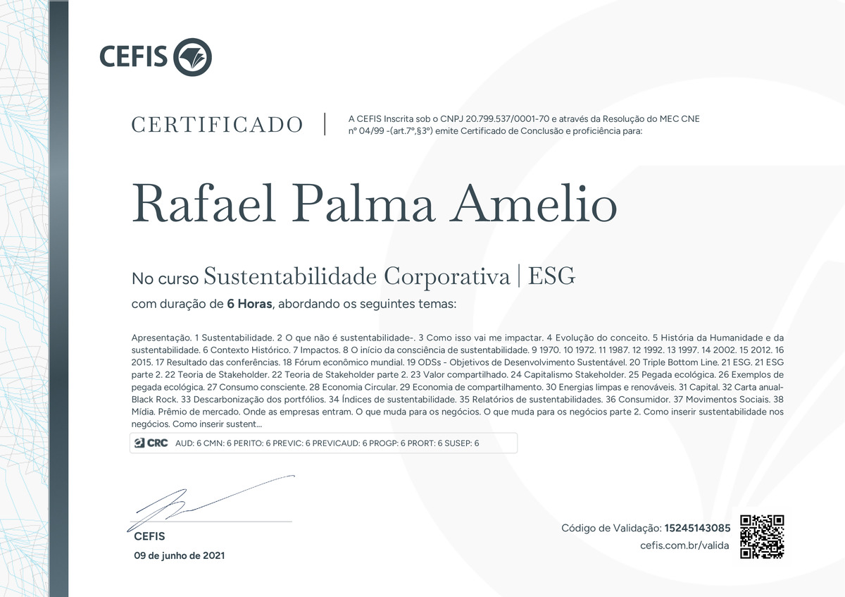 O certificado acima atesta que RAFAEL PALMA AMELIO concluiu com êxito o curso Sustentabilidade Corporativa | ESG em 09/06/2021 às 20:06:29, ministrado por Alessandra Vasconcelos.