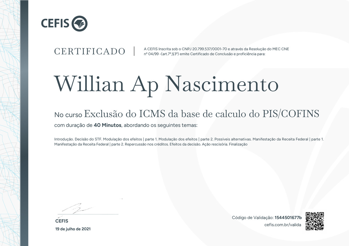 O certificado acima atesta que WILLIAN AP NASCIMENTO concluiu com êxito o curso Exclusão do ICMS da base de calculo do PIS/COFINS em 19/07/2021 às 16:07:02, ministrado por Cristiane Pires.