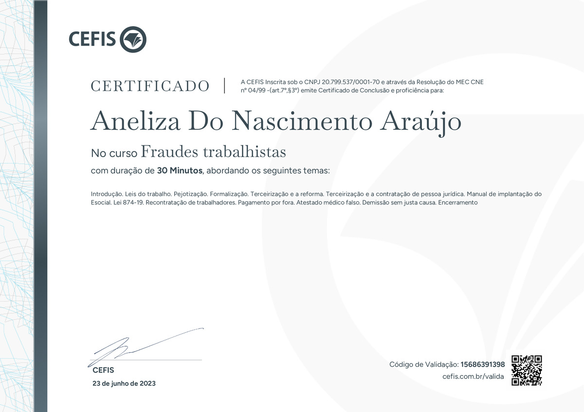 O certificado acima atesta que ANELIZA DO NASCIMENTO ARAÚJO concluiu com êxito o curso Fraudes trabalhistas em 23/06/2023 às 14:06:29, ministrado por JEFFERSON DANTAS.