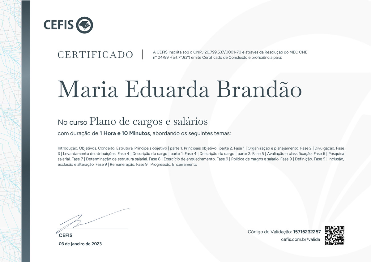 O certificado acima atesta que Maria Eduarda Brandão concluiu com êxito o curso Plano de cargos e salários em 03/01/2023 às 18:01:25,