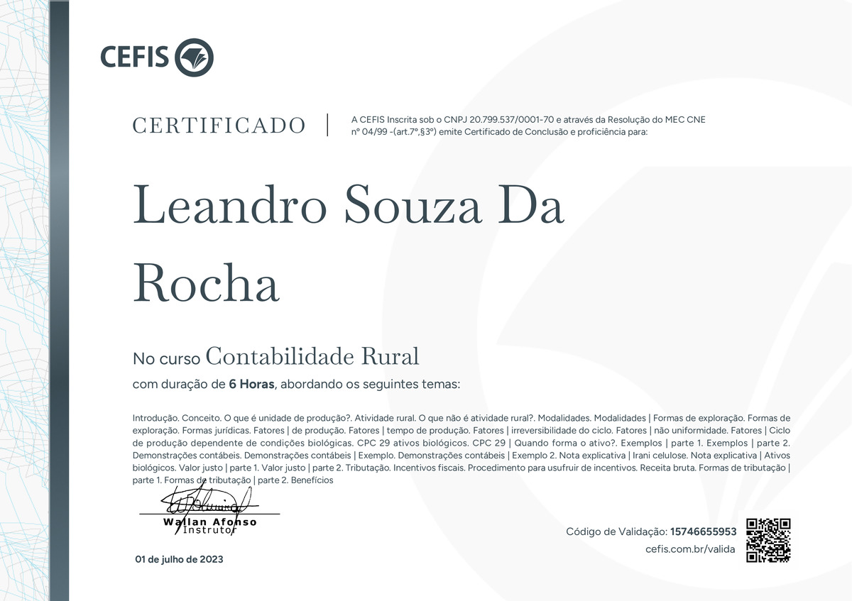 O certificado acima atesta que LEANDRO SOUZA DA ROCHA concluiu com êxito o curso Contabilidade Rural em 01/07/2023 às 12:07:30,
