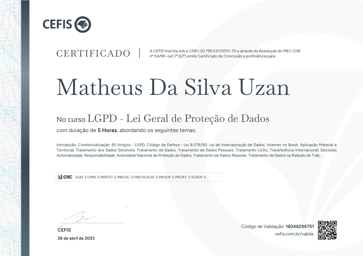 O certificado acima atesta que MATHEUS DA SILVA UZAN concluiu com êxito o curso LGPD - Lei Geral de Proteção de Dados em 28/04/2023 às 11:04:35,