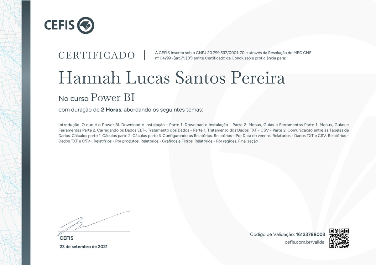 O certificado acima atesta que HANNAH LUCAS SANTOS PEREIRA concluiu com êxito o curso Power BI em 23/09/2021 às 09:09:56,
