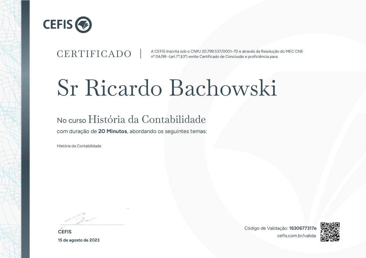 O certificado acima atesta que SR RICARDO BACHOWSKI concluiu com êxito o curso História da Contabilidade em 15/08/2023 às 11:08:51, ministrado por CEFIS.
