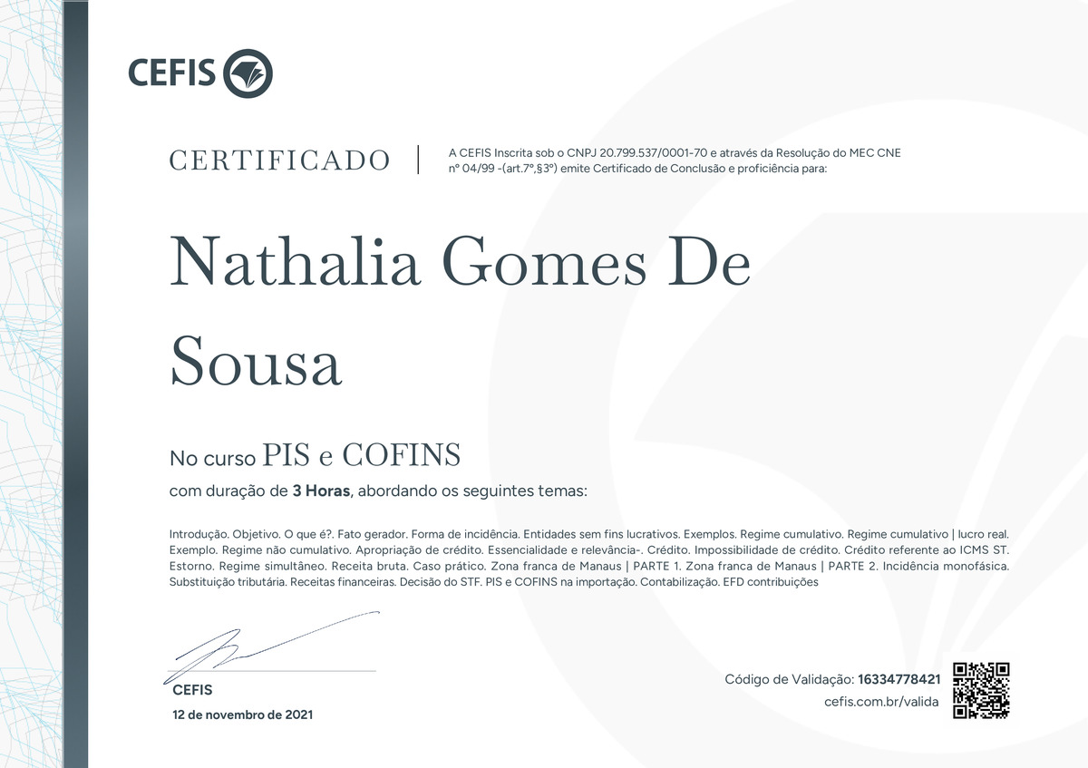 O certificado acima atesta que NATHALIA GOMES DE SOUSA concluiu com êxito o curso PIS e COFINS em 12/11/2021 às 00:11:03,