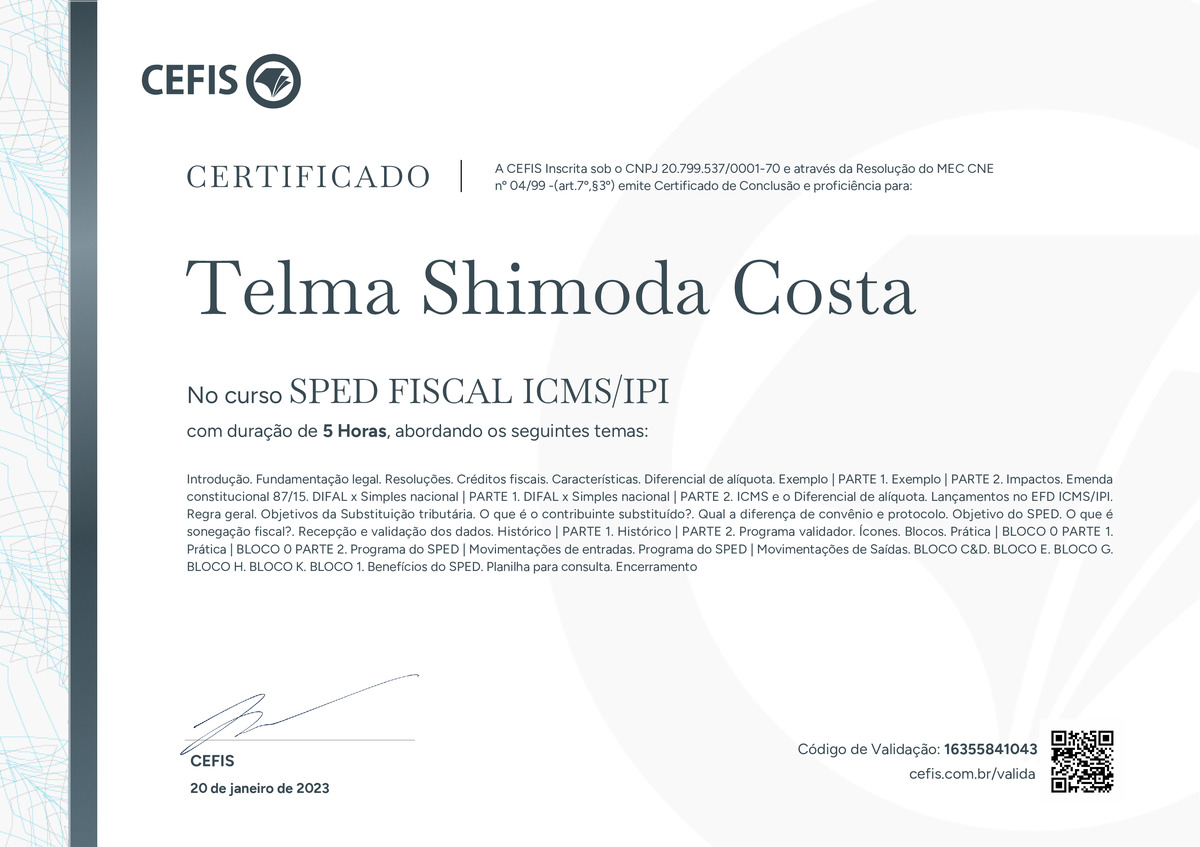 O certificado acima atesta que TELMA SHIMODA COSTA concluiu com êxito o curso SPED FISCAL ICMS/IPI em 20/01/2023 às 11:01:59,