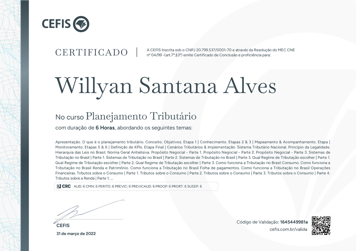 O certificado acima atesta que WILLYAN SANTANA ALVES concluiu com êxito o curso Planejamento Tributário em 31/03/2022 às 10:03:29, ministrado por RICARDO PRADO.