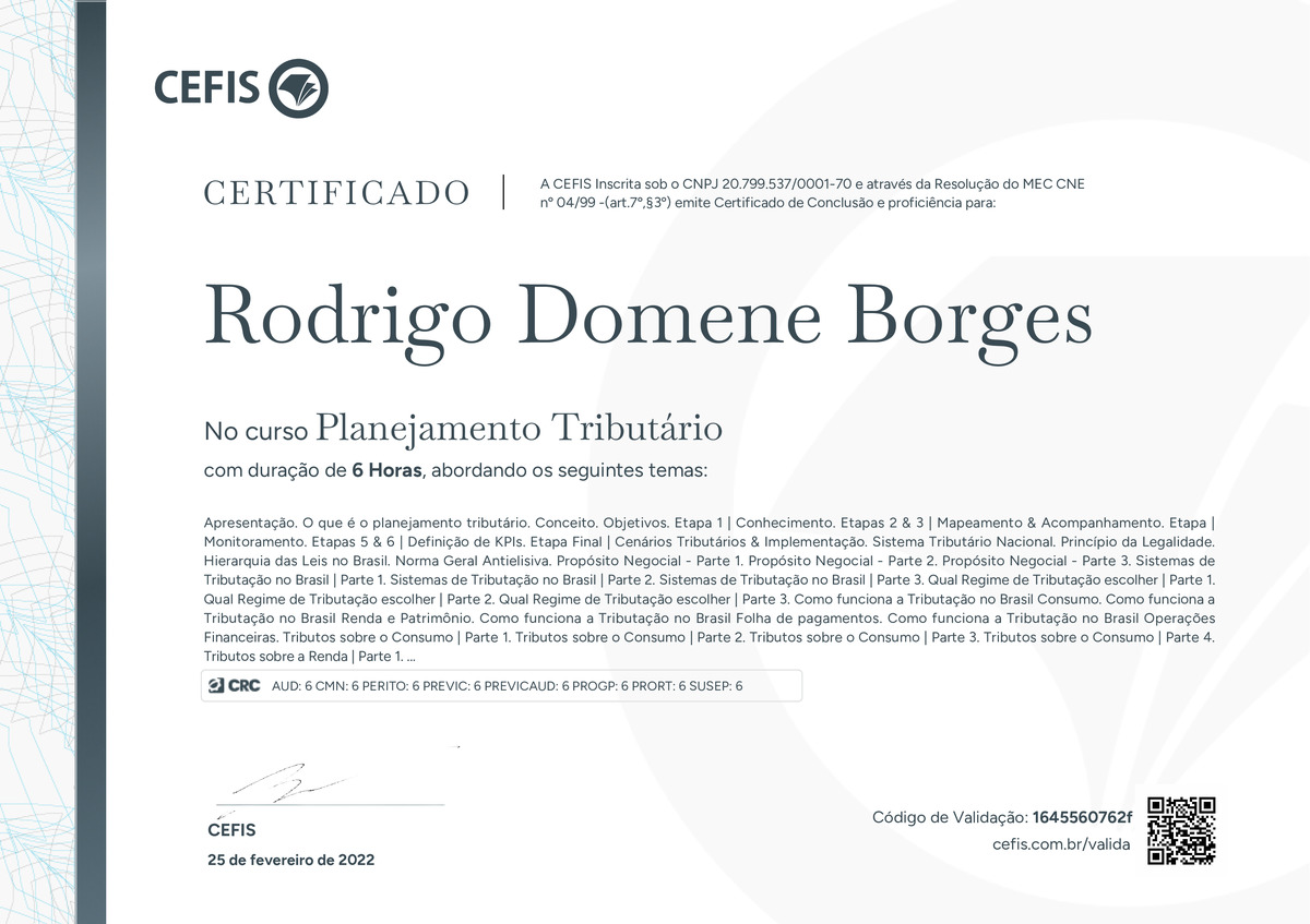 O certificado acima atesta que RODRIGO DOMENE BORGES concluiu com êxito o curso Planejamento Tributário em 25/02/2022 às 12:02:04, ministrado por RICARDO PRADO.