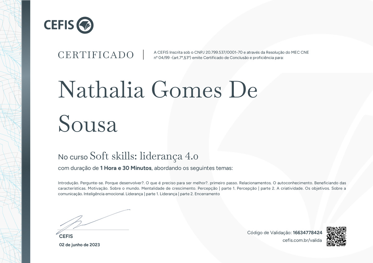 O certificado acima atesta que NATHALIA GOMES DE SOUSA concluiu com êxito o curso Soft skills: liderança 4.0 em 02/06/2023 às 20:06:50,