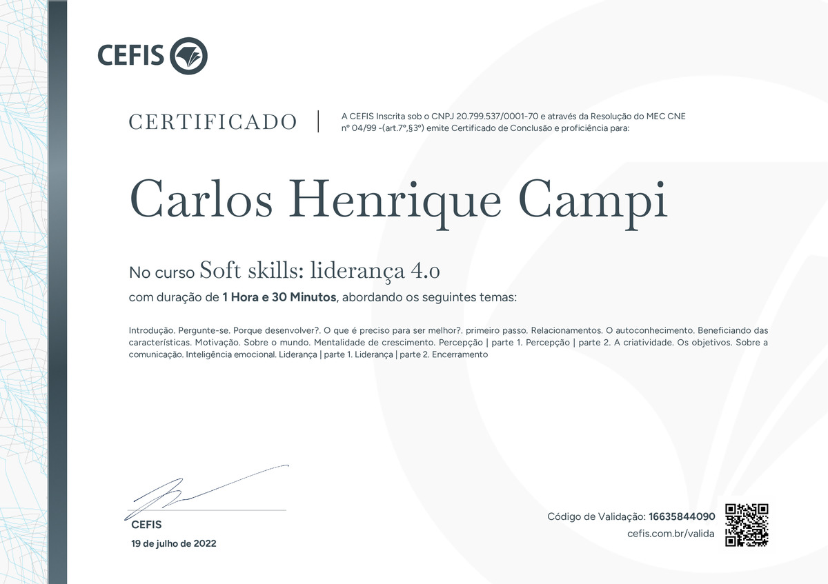 O certificado acima atesta que CARLOS HENRIQUE CAMPI concluiu com êxito o curso Soft skills: liderança 4.0 em 19/07/2022 às 15:07:37,