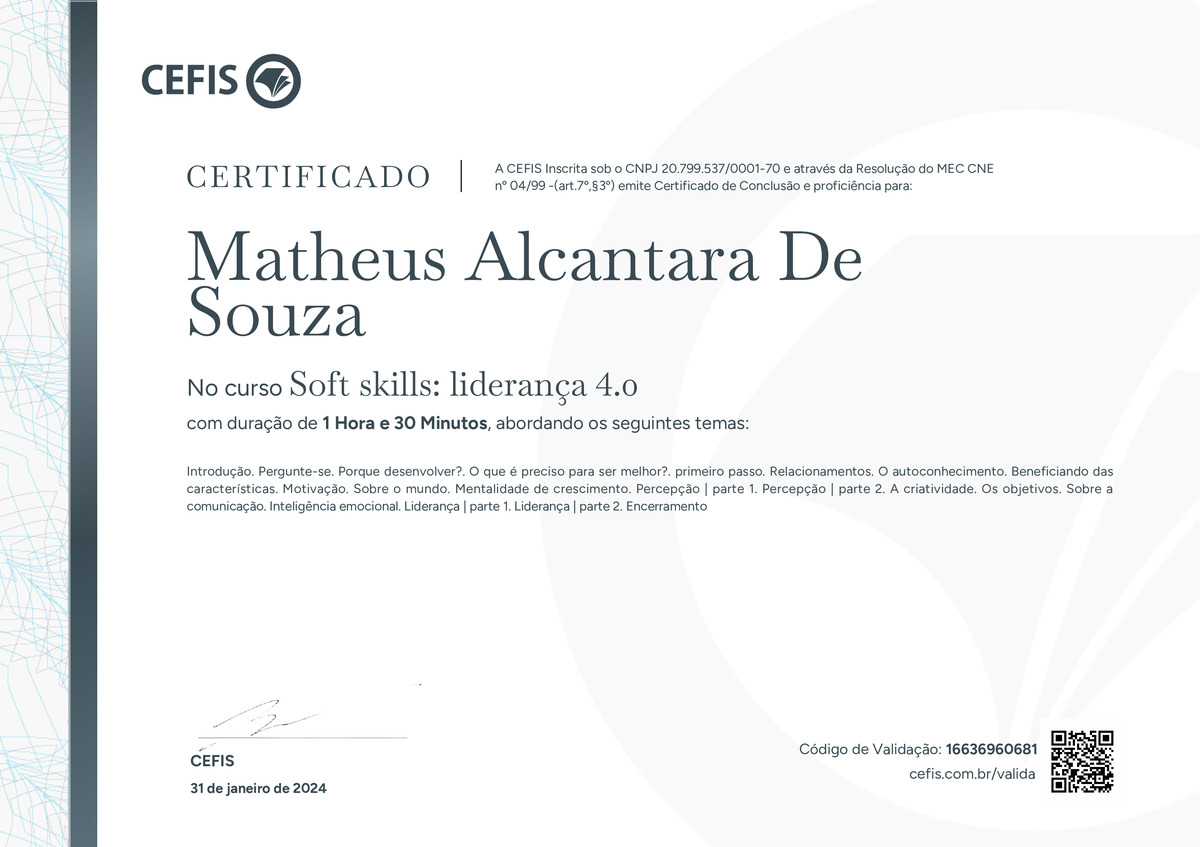 O certificado acima atesta que MATHEUS ALCANTARA DE SOUZA concluiu com êxito o curso Soft skills: liderança 4.0 em 31/01/2024 às 11:01:26,