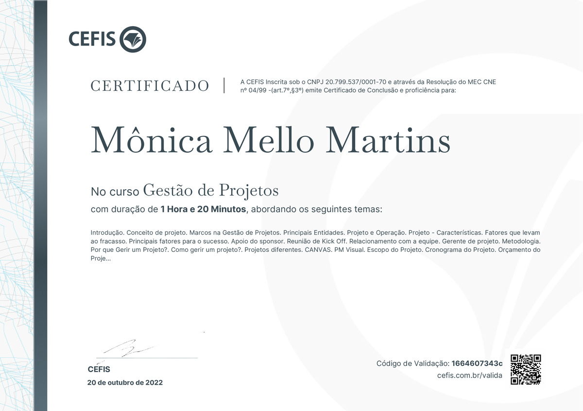 O certificado acima atesta que MÔNICA MELLO MARTINS concluiu com êxito o curso Gestão de Projetos em 20/10/2022 às 17:10:50,