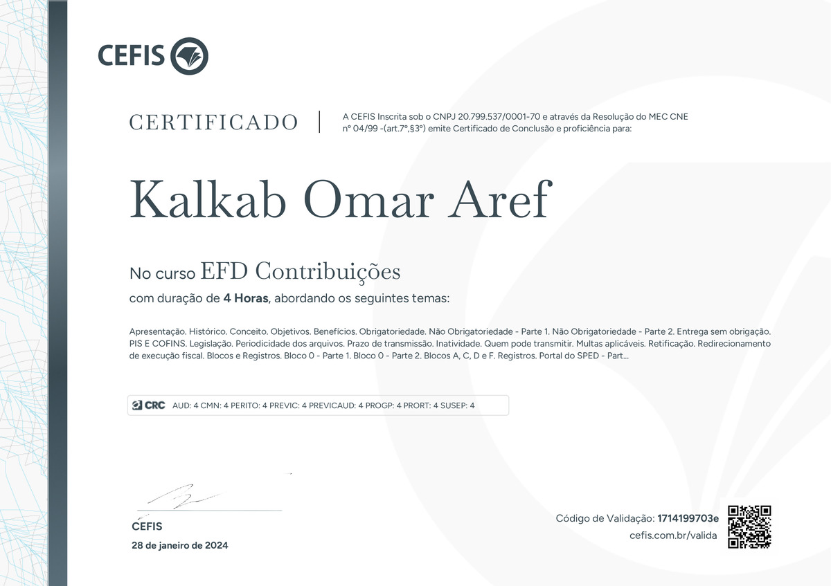 O certificado acima atesta que Kalkab Omar Aref concluiu com êxito o curso EFD Contribuições em 28/01/2024 às 10:01:11,