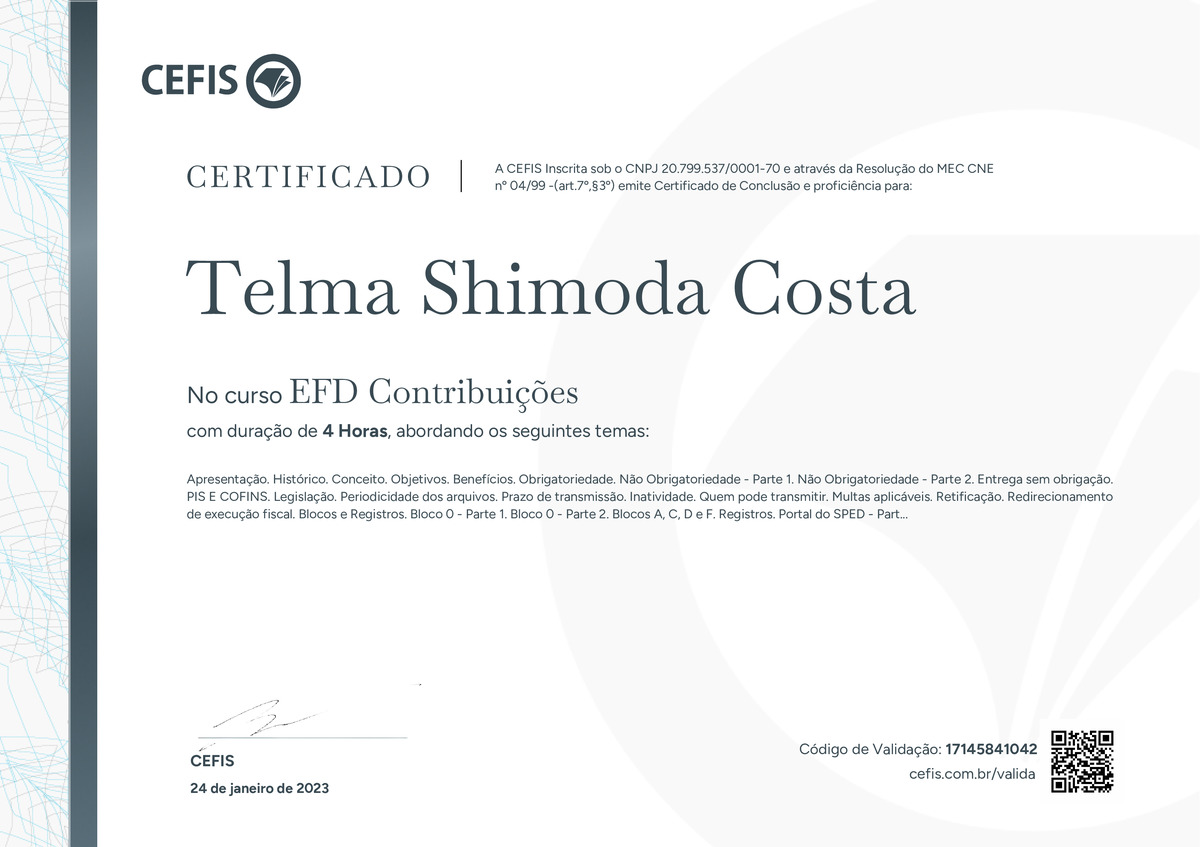 O certificado acima atesta que TELMA SHIMODA COSTA concluiu com êxito o curso EFD Contribuições em 24/01/2023 às 17:01:02,