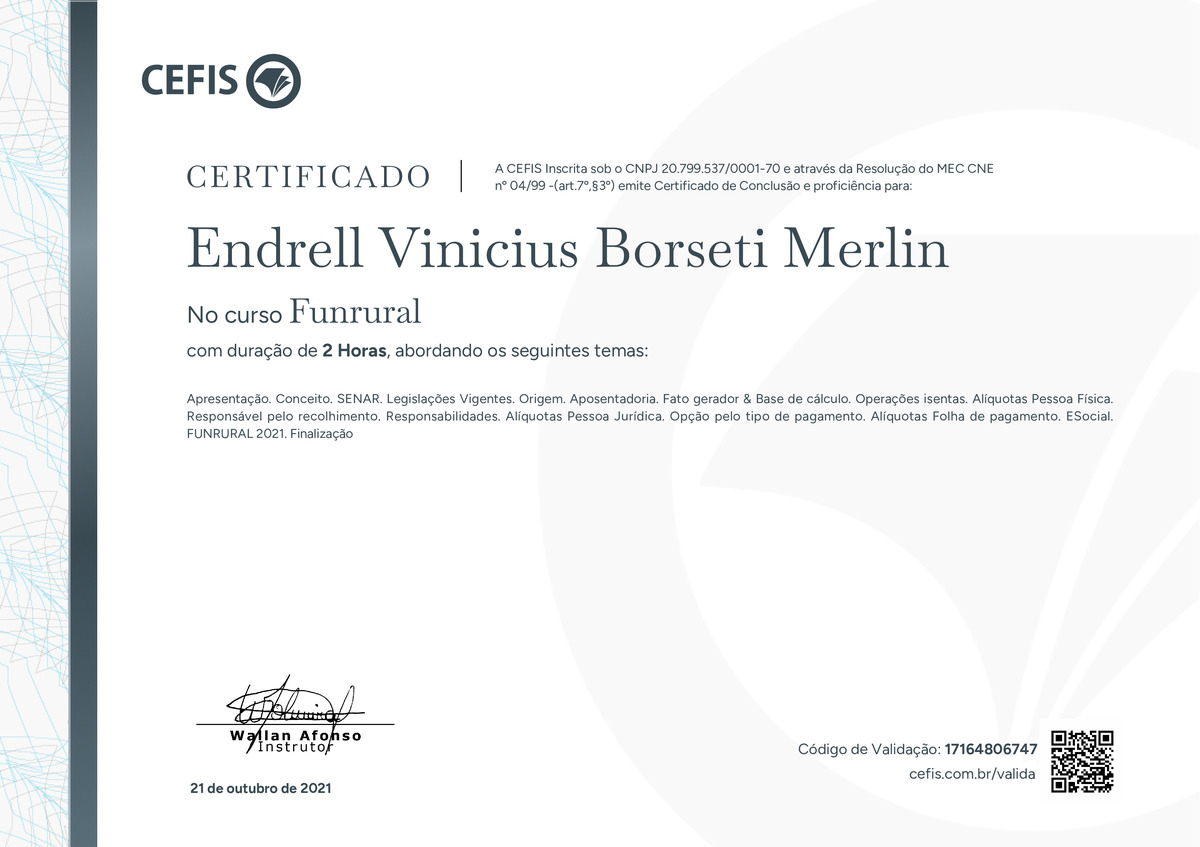 O certificado acima atesta que ENDRELL VINICIUS BORSETI MERLIN concluiu com êxito o curso Funrural em 21/10/2021 às 23:10:24,