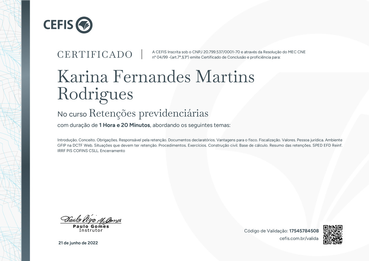 O certificado acima atesta que KARINA FERNANDES MARTINS RODRIGUES concluiu com êxito o curso Retenções previdenciárias em 21/06/2022 às 10:06:32, ministrado por PAULO GOMES.