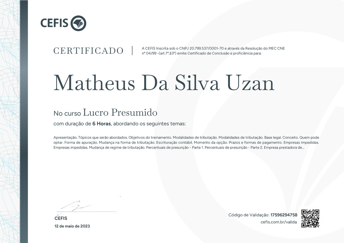 O certificado acima atesta que MATHEUS DA SILVA UZAN concluiu com êxito o curso Lucro Presumido em 12/05/2023 às 12:05:20,