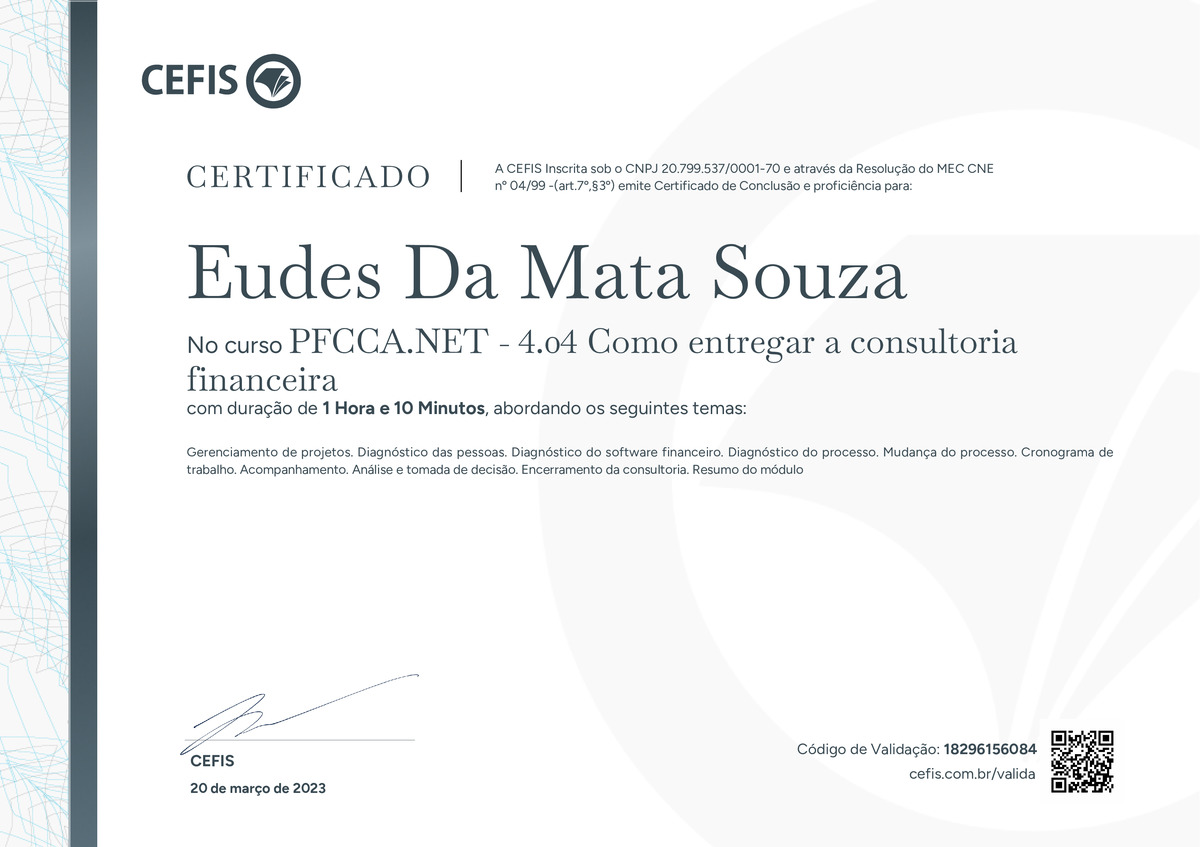 O certificado acima atesta que Eudes da Mata Souza concluiu com êxito o curso PFCCA.NET - 4.04 Como entregar a consultoria financeira em 20/03/2023 às 01:03:09, ministrado por GLAUBER R. MACHADO.