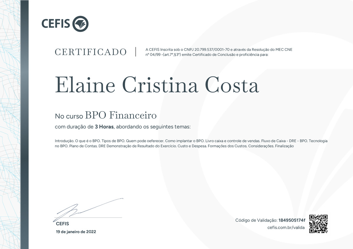 O certificado acima atesta que ELAINE CRISTINA COSTA concluiu com êxito o curso BPO Financeiro em 19/01/2022 às 13:01:20, ministrado por DAYANE DA SILVA AMARO ROSA.