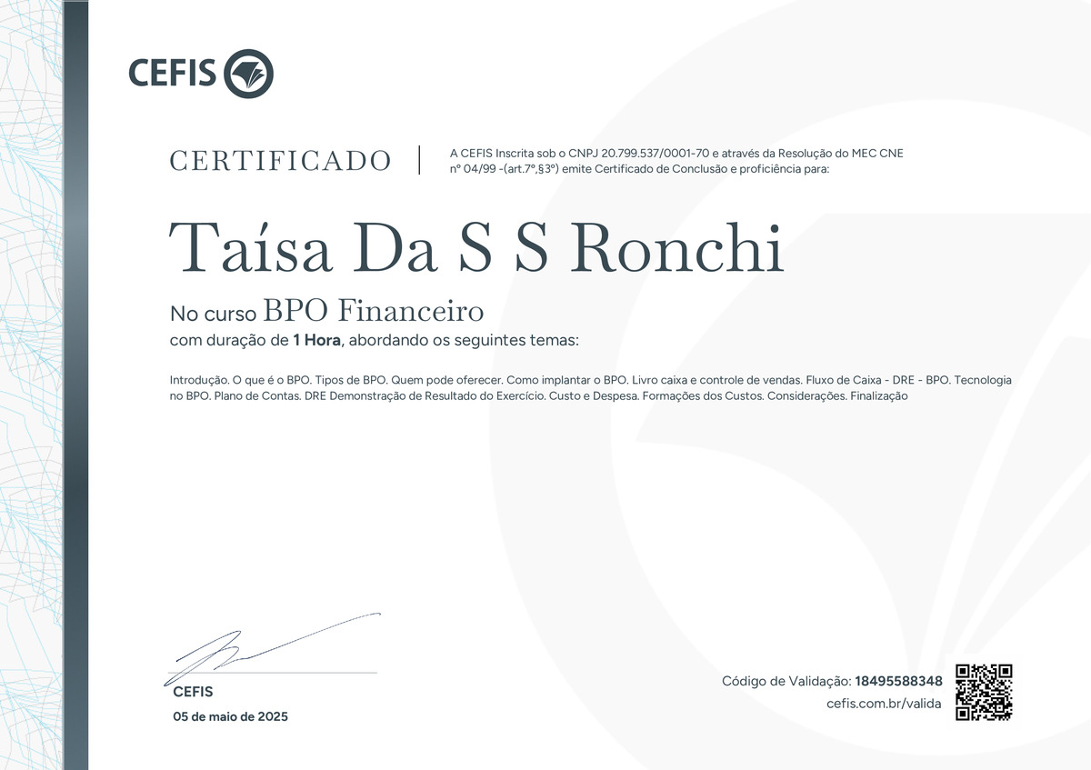 O certificado acima atesta que TAÍSA DA S S RONCHI concluiu com êxito o curso BPO Financeiro em 05/05/2025 às 09:05:32,