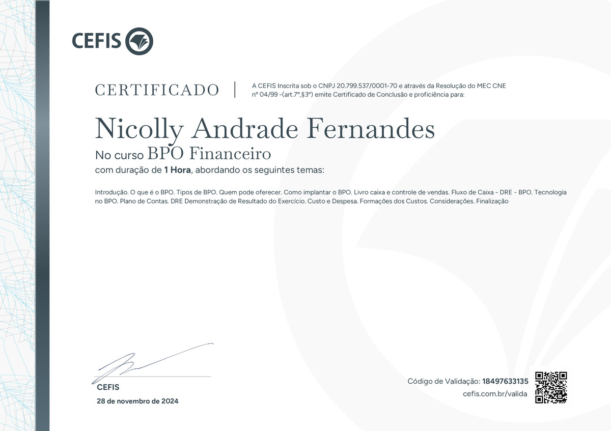 O certificado acima atesta que Nicolly Andrade Fernandes concluiu com êxito o curso BPO Financeiro em 28/11/2024 às 11:11:52,