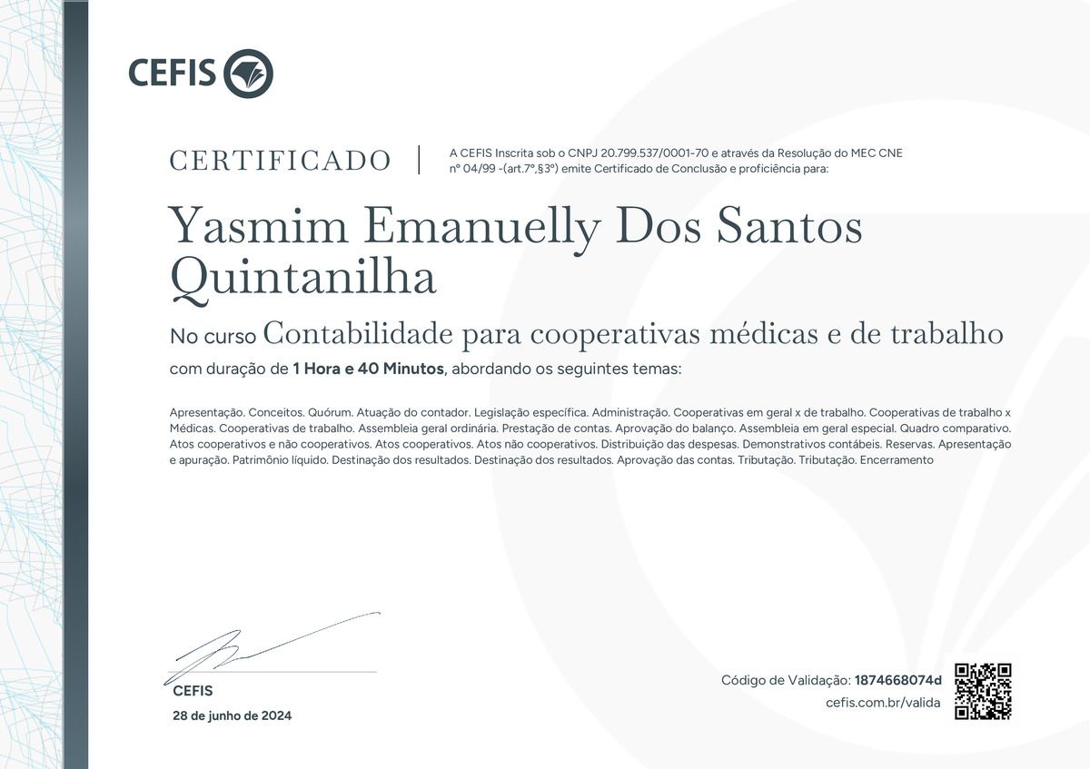 O certificado acima atesta que YASMIM EMANUELLY DOS SANTOS QUINTANILHA concluiu com êxito o curso Contabilidade para cooperativas médicas e de trabalho em 28/06/2024 às 15:06:42,