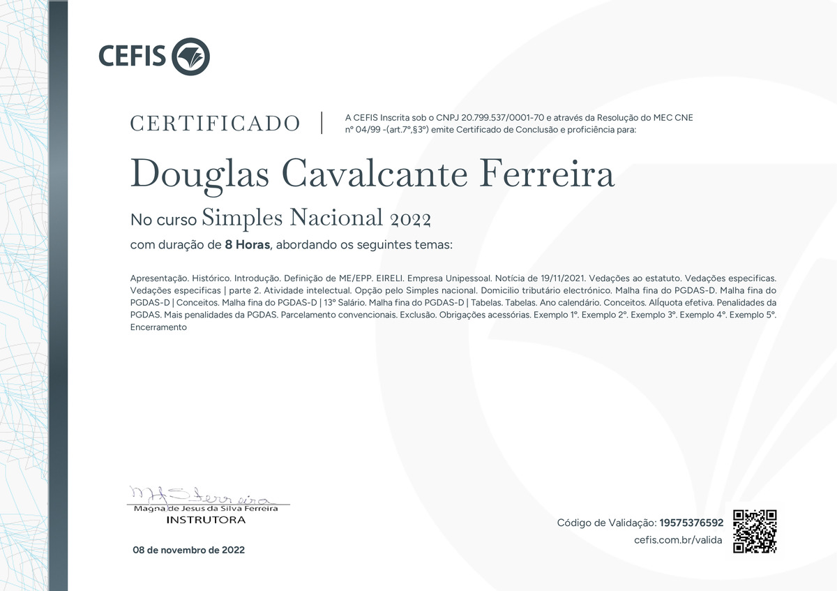 O certificado acima atesta que DOUGLAS CAVALCANTE FERREIRA concluiu com êxito o curso Simples Nacional 2022 em 08/11/2022 às 15:11:33,