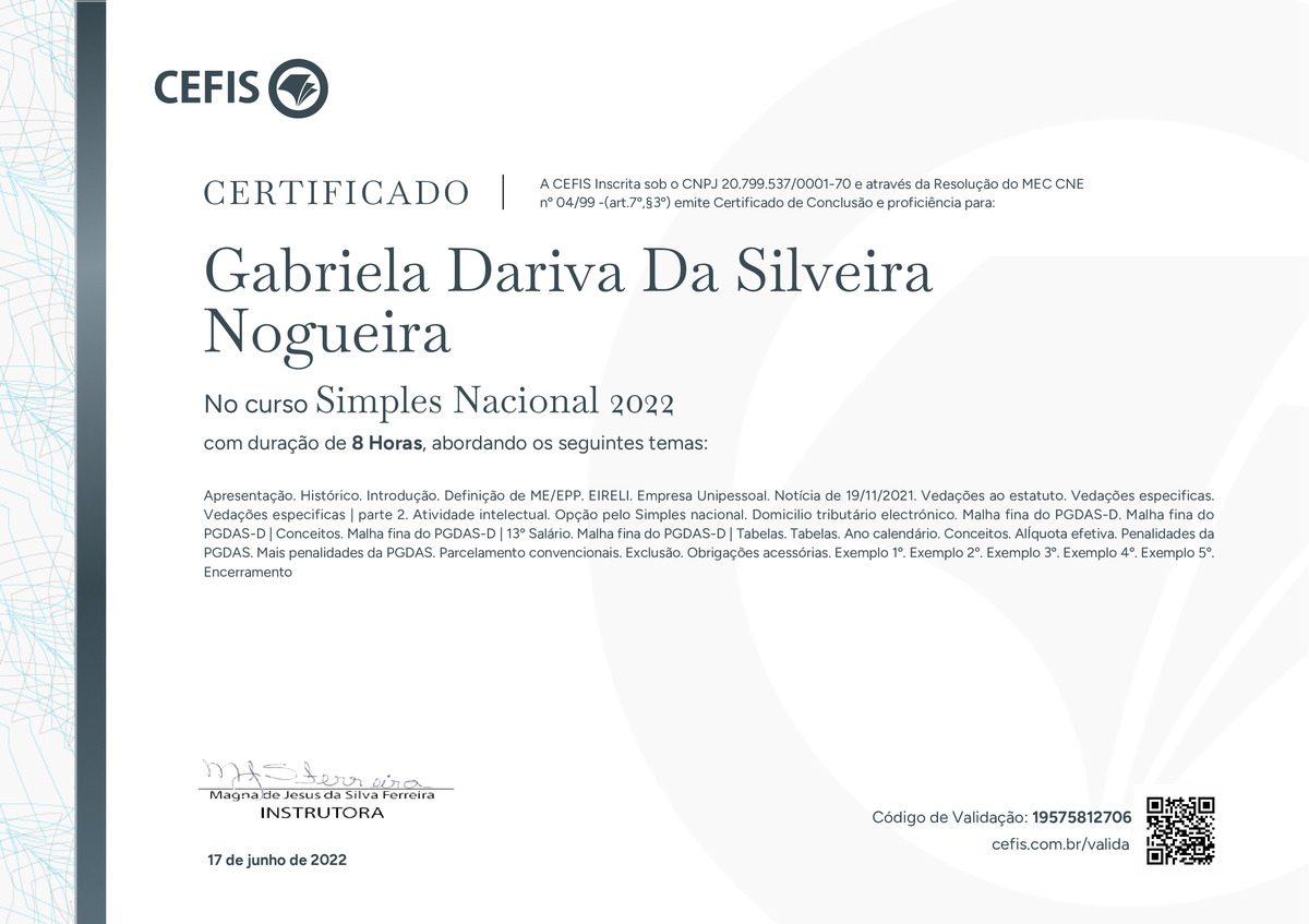 O certificado acima atesta que GABRIELA DARIVA DA SILVEIRA NOGUEIRA concluiu com êxito o curso Simples Nacional 2022 em 17/06/2022 às 10:06:50,