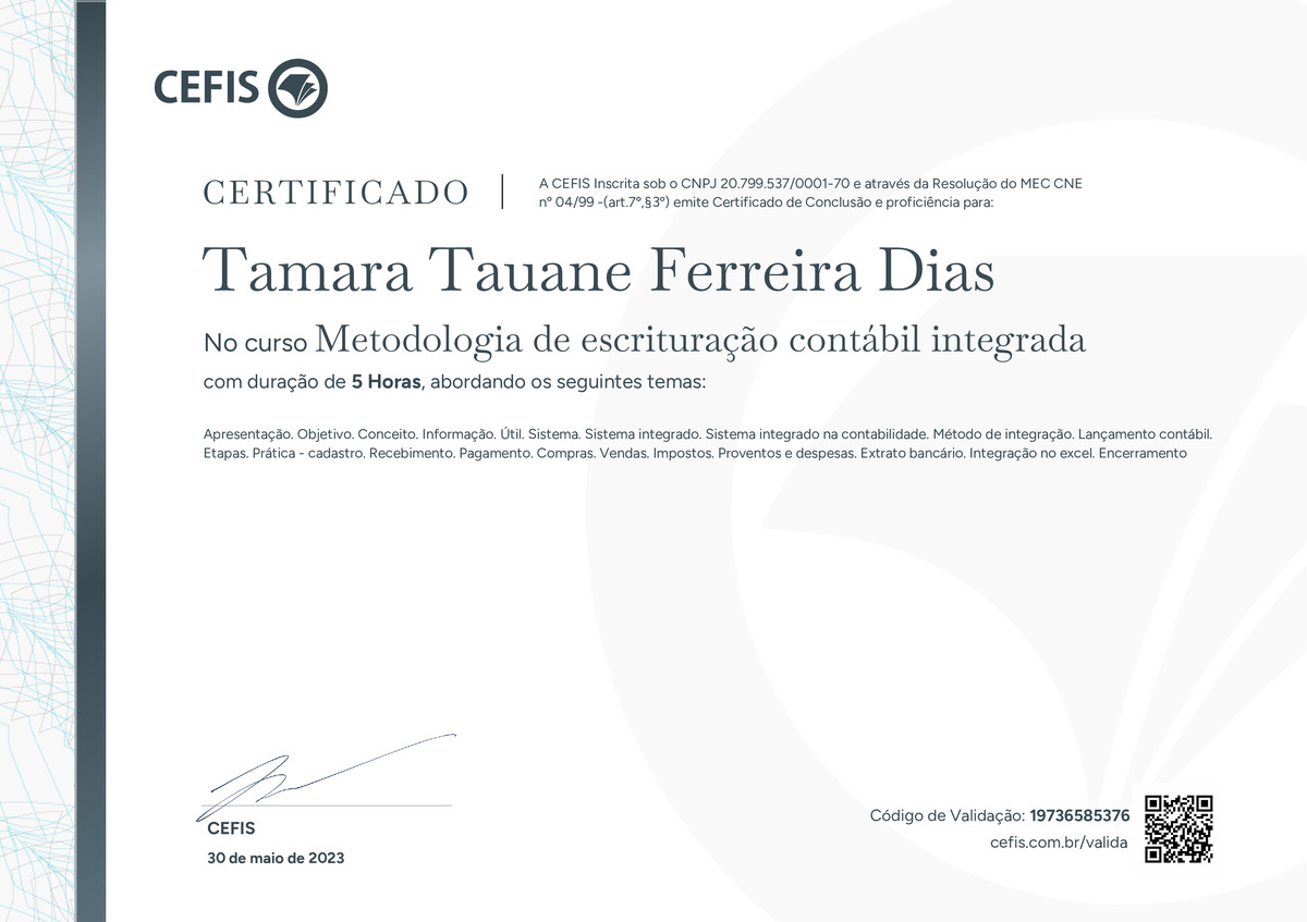 O certificado acima atesta que TAMARA TAUANE FERREIRA DIAS concluiu com êxito o curso Metodologia de escrituração contábil integrada em 30/05/2023 às 17:05:49,