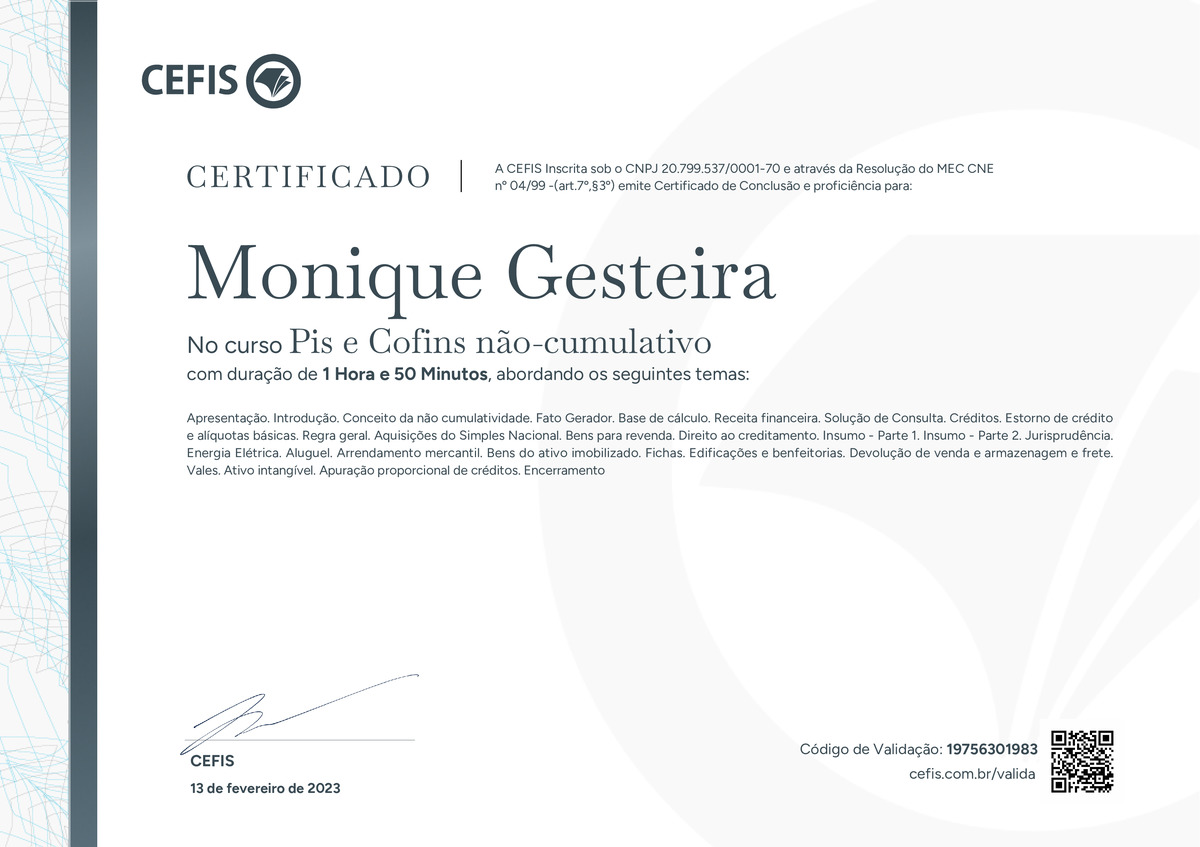 O certificado acima atesta que MONIQUE GESTEIRA concluiu com êxito o curso Pis e Cofins não-cumulativo em 13/02/2023 às 14:02:13, ministrado por Kleber Antonio dos Santos.
