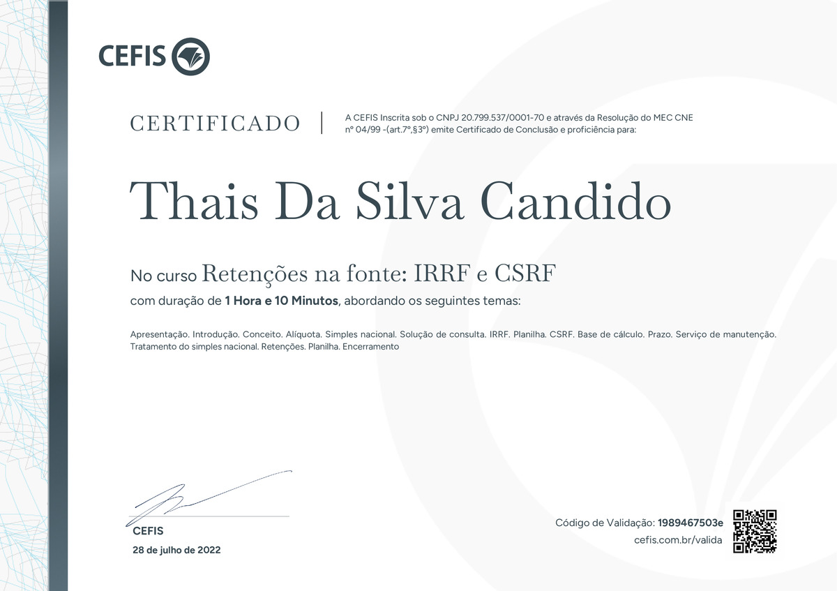 O certificado acima atesta que THAIS DA SILVA CANDIDO concluiu com êxito o curso Retenções na fonte: IRRF e CSRF em 28/07/2022 às 19:07:13, ministrado por GRAZIELLA SANTOS.