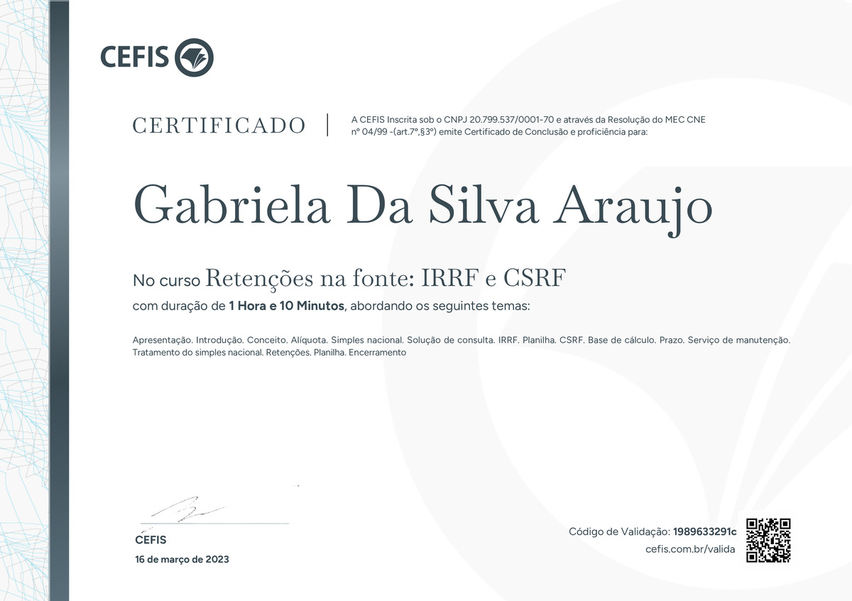 O certificado acima atesta que GABRIELA DA SILVA ARAUJO concluiu com êxito o curso Retenções na fonte: IRRF e CSRF em 16/03/2023 às 20:03:49, ministrado por GRAZIELLA SANTOS.