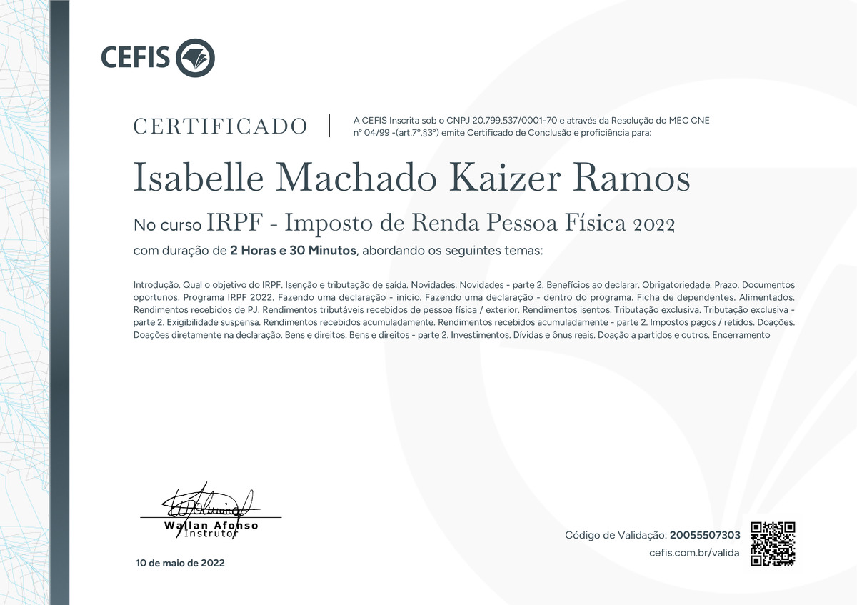 O certificado acima atesta que ISABELLE MACHADO KAIZER RAMOS concluiu com êxito o curso IRPF - Imposto de Renda Pessoa Física 2022 em 10/05/2022 às 16:05:14,
