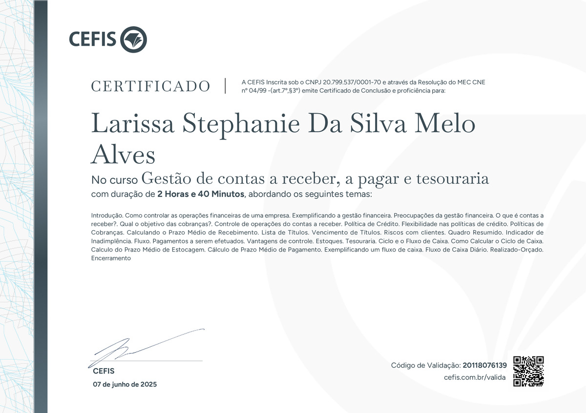 O certificado acima atesta que LARISSA STEPHANIE DA SILVA MELO ALVES concluiu com êxito o curso Gestão de contas a receber, a pagar e tesouraria em 07/06/2025 às 23:06:52, ministrado por MAURI JOSÉ ALBERTI.