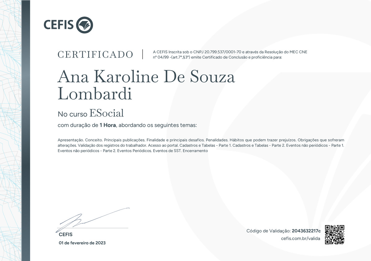 O certificado acima atesta que ANA KAROLINE DE SOUZA LOMBARDI concluiu com êxito o curso ESocial em 01/02/2023 às 11:02:19,