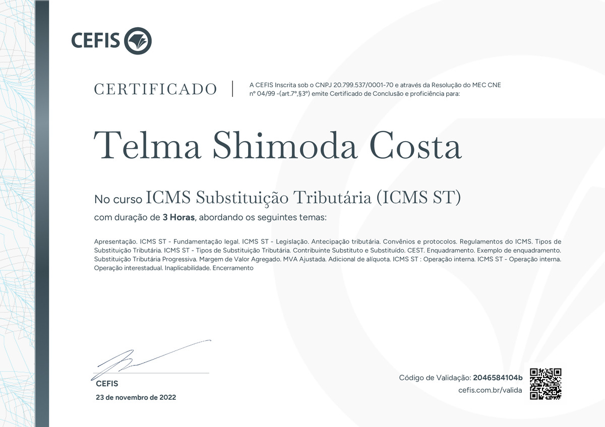 O certificado acima atesta que TELMA SHIMODA COSTA concluiu com êxito o curso ICMS Substituição Tributária (ICMS ST) em 23/11/2022 às 11:11:00,