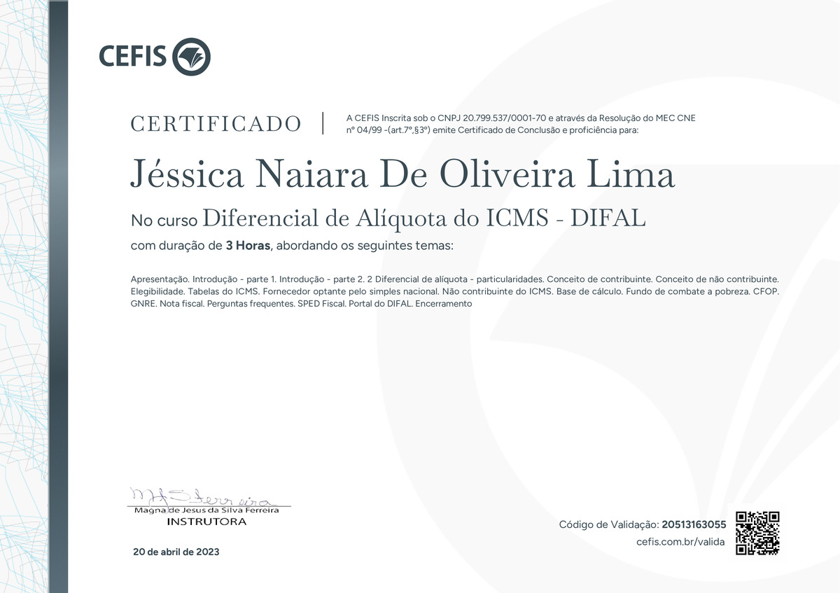 O certificado acima atesta que JÉSSICA NAIARA DE OLIVEIRA LIMA concluiu com êxito o curso Diferencial de Alíquota do ICMS - DIFAL em 20/04/2023 às 09:04:33,
