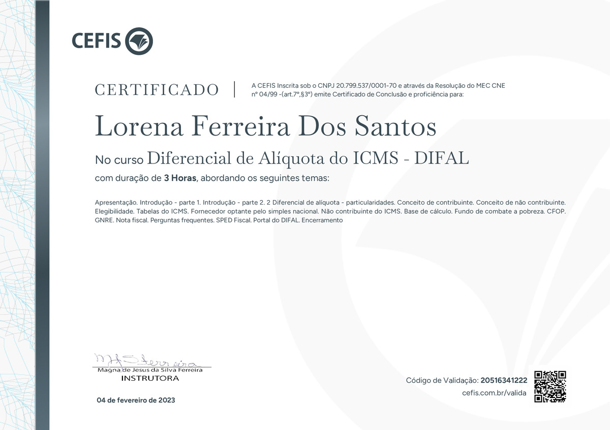 O certificado acima atesta que LORENA FERREIRA DOS SANTOS concluiu com êxito o curso Diferencial de Alíquota do ICMS - DIFAL em 04/02/2023 às 21:02:05, ministrado por MAGNA FERREIRA.