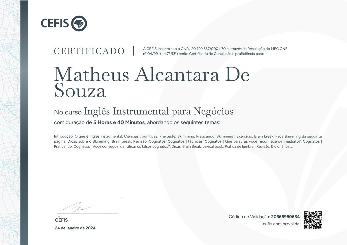 O certificado acima atesta que MATHEUS ALCANTARA DE SOUZA concluiu com êxito o curso Inglês Instrumental para Negócios em 24/01/2024 às 09:01:24,