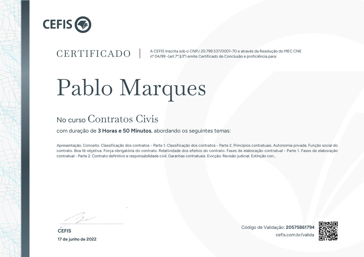 O certificado acima atesta que PABLO MARQUES concluiu com êxito o curso Contratos Civis em 17/06/2022 às 21:06:24, ministrado por FÁBIO CARDOSO.