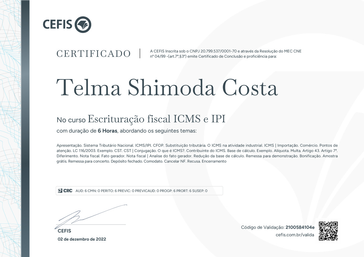 O certificado acima atesta que TELMA SHIMODA COSTA concluiu com êxito o curso Escrituração fiscal ICMS e IPI em 02/12/2022 às 11:12:10,