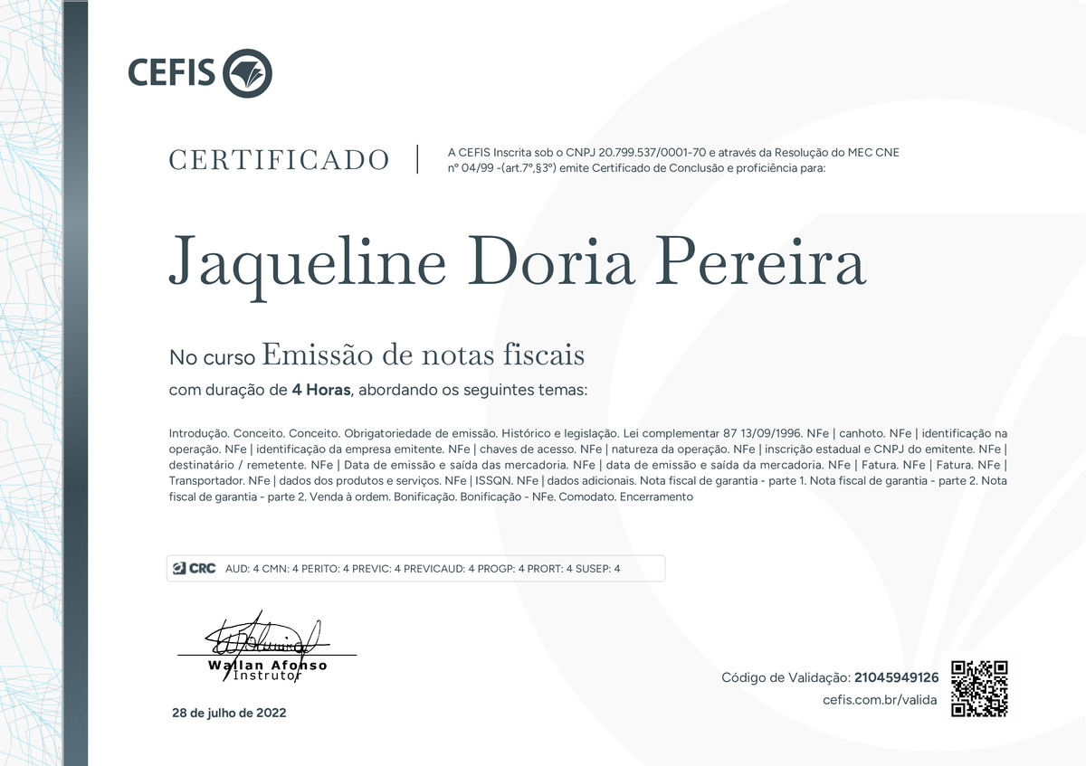O certificado acima atesta que JAQUELINE DORIA PEREIRA concluiu com êxito o curso Emissão de notas fiscais em 28/07/2022 às 15:07:59,