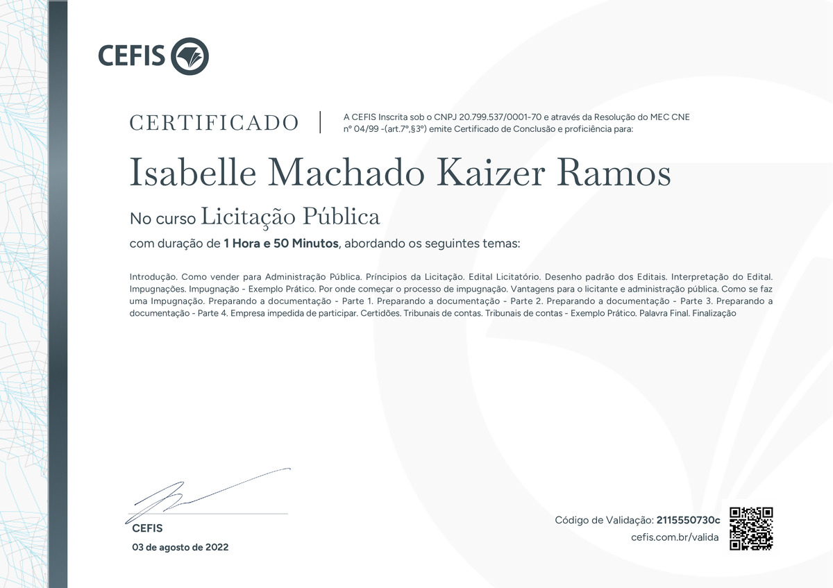 O certificado acima atesta que ISABELLE MACHADO KAIZER RAMOS concluiu com êxito o curso Licitação Pública em 03/08/2022 às 16:08:25, ministrado por KLEBER MEDRADO.