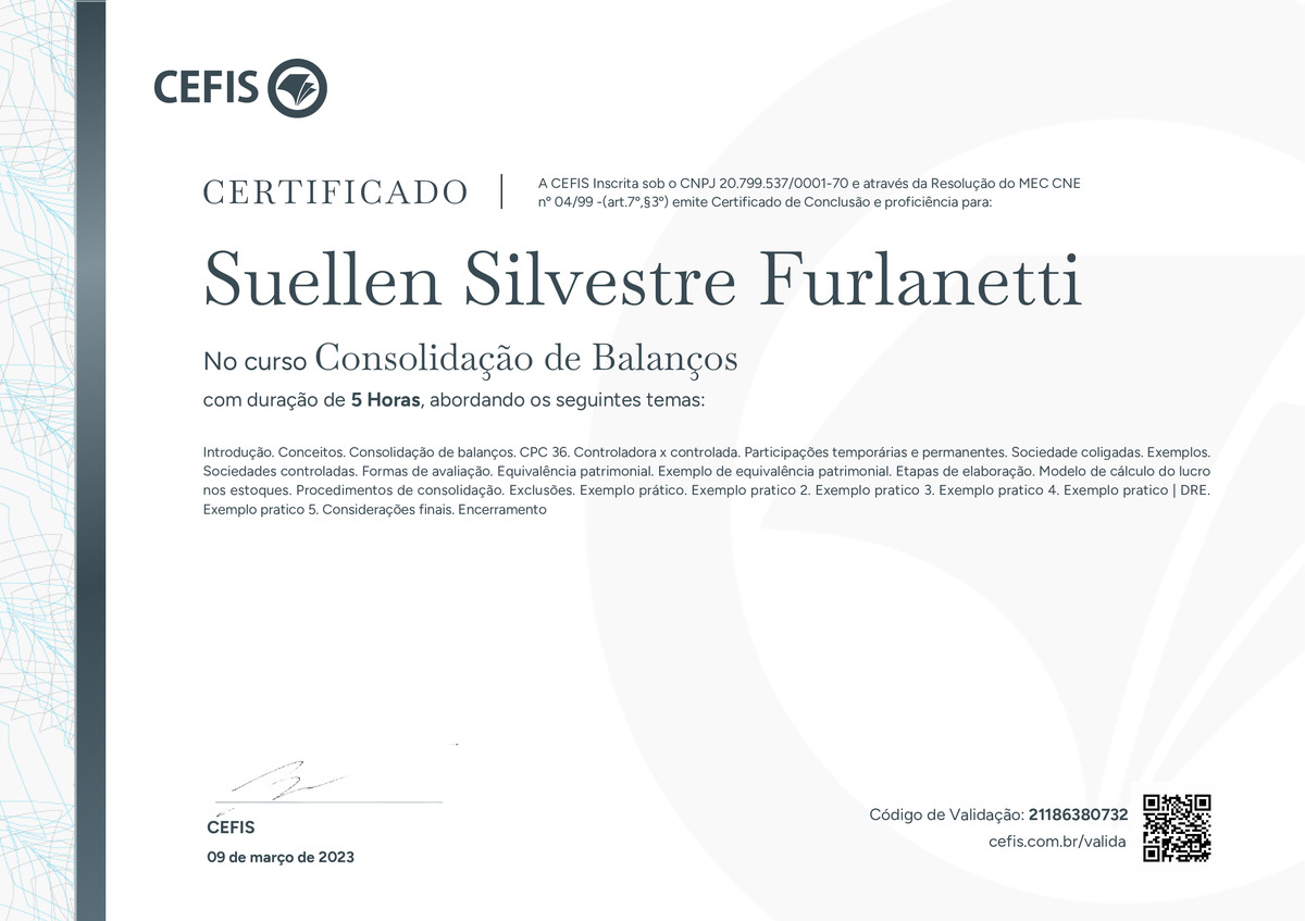 O certificado acima atesta que SUELLEN SILVESTRE FURLANETTI concluiu com êxito o curso Consolidação de Balanços em 09/03/2023 às 08:03:17,