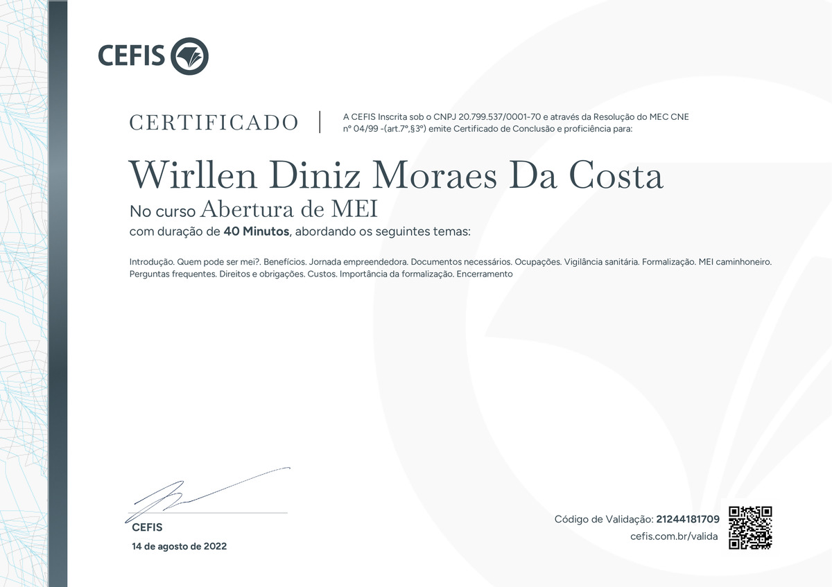 O certificado acima atesta que WIRLLEN DINIZ MORAES DA COSTA concluiu com êxito o curso Abertura de MEI em 14/08/2022 às 18:08:53,