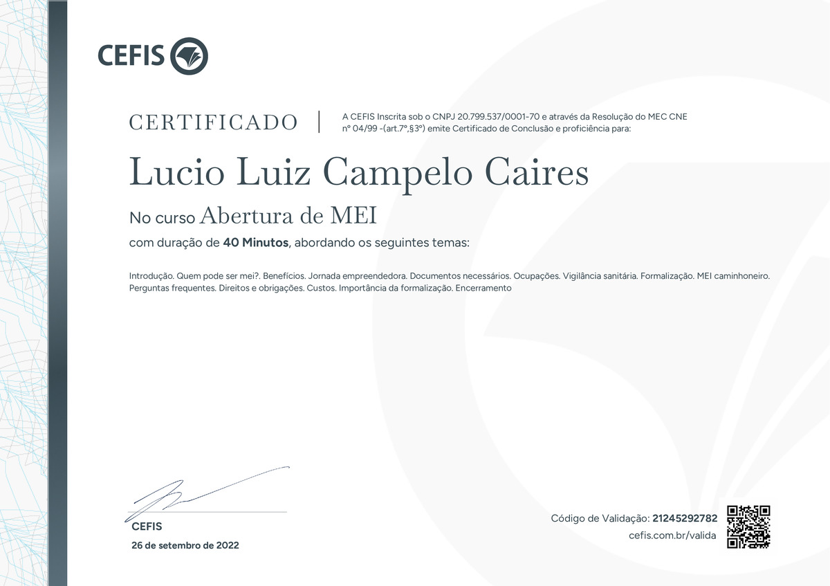 O certificado acima atesta que LUCIO LUIZ CAMPELO CAIRES concluiu com êxito o curso Abertura de MEI em 26/09/2022 às 11:09:34,